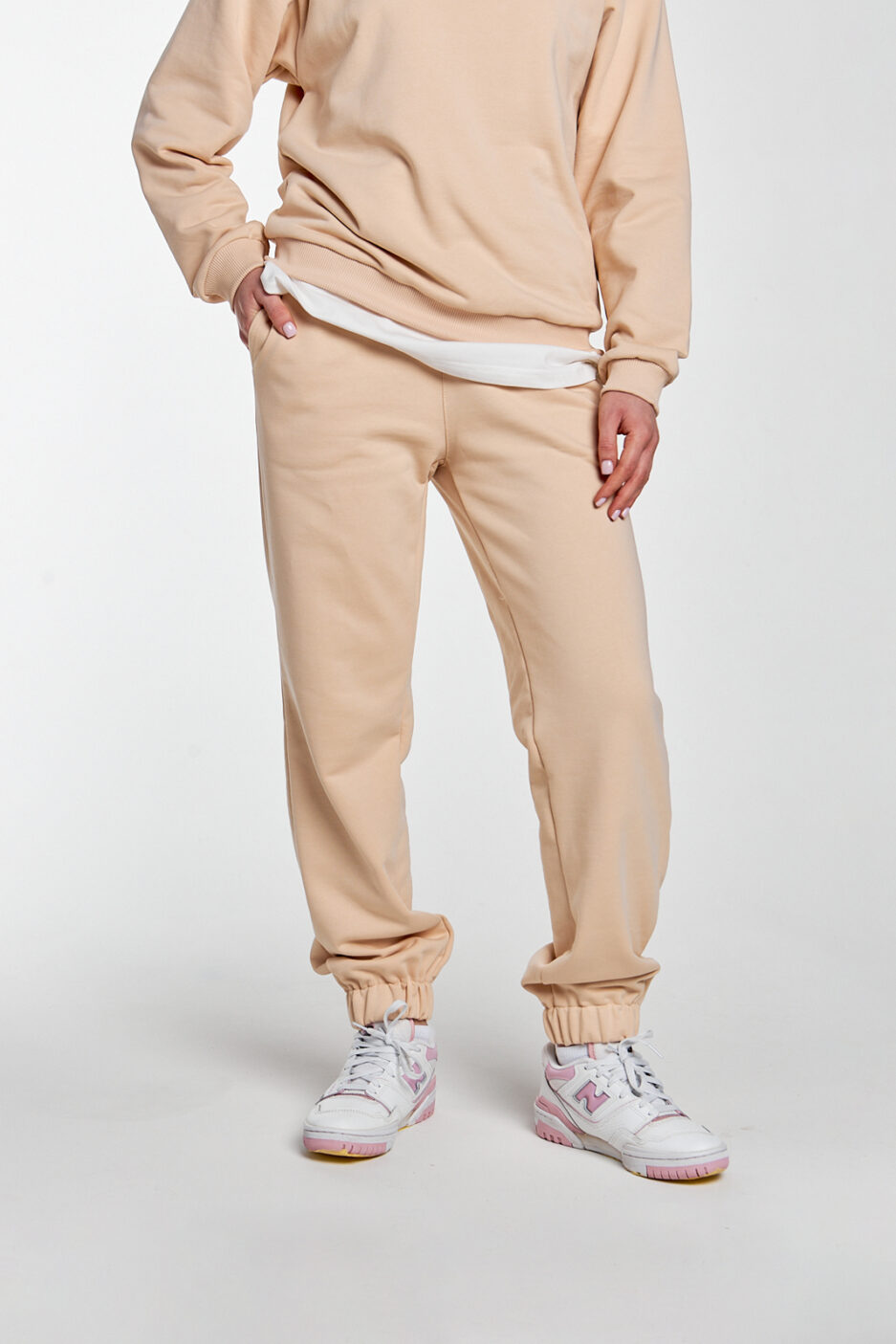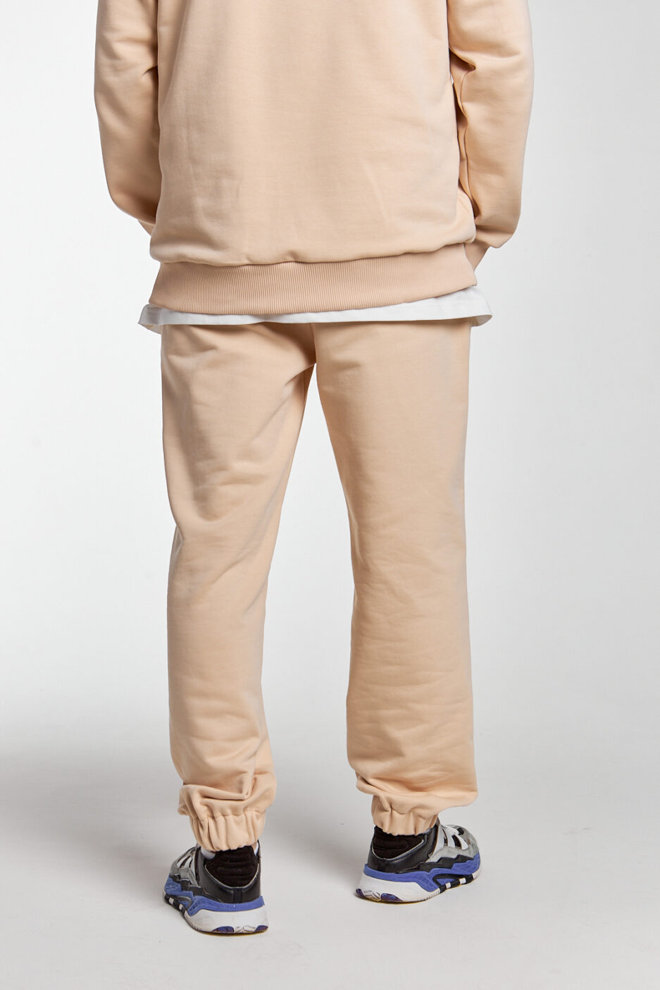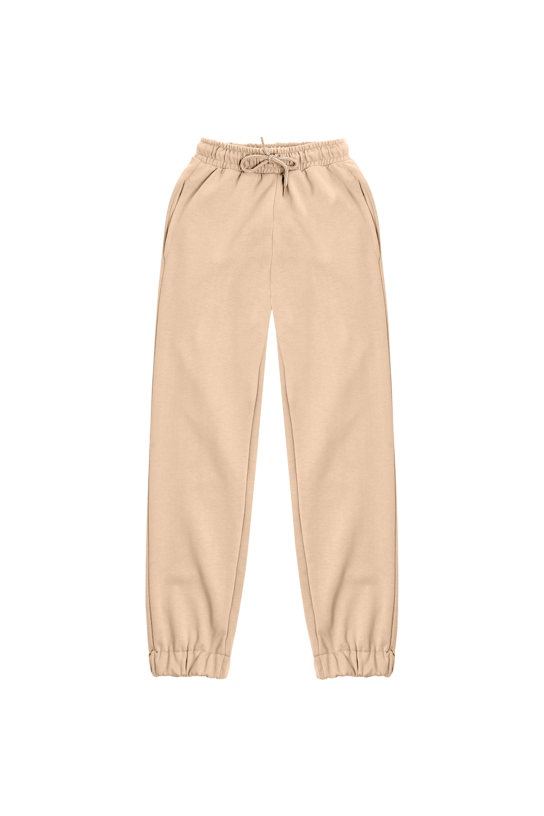 штани у бежевому кольорі мають 2 бічні кишені, затягувальні шнурки, за допомогою яких ви можете змінювати об’єм і посадку на більш бажану, а довжину можна зменшити, підгорнувши манжети знизу, що зробить ваш образ більш мішкуватим ці штани універсальні, їх можна комбінувати з більшістю речей, а для створення костюма можете обрати світшот чи футболку цього ж кольору