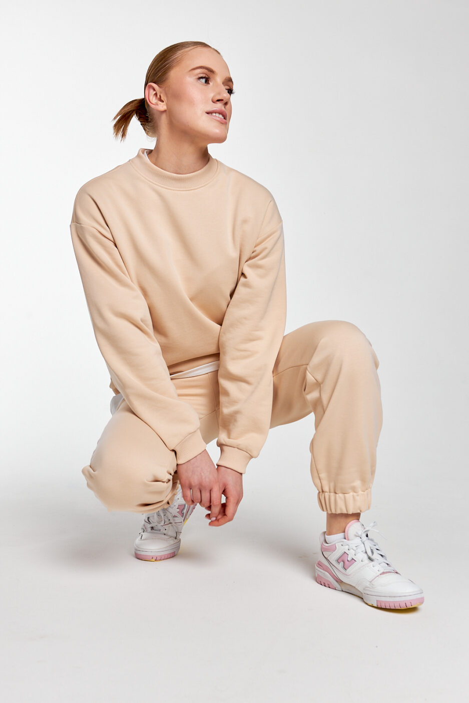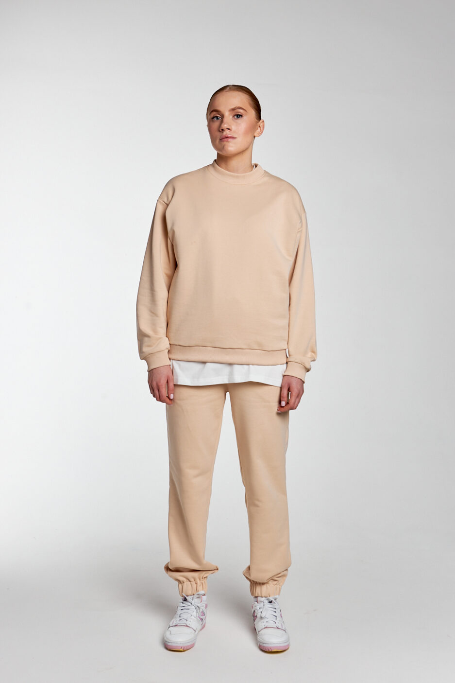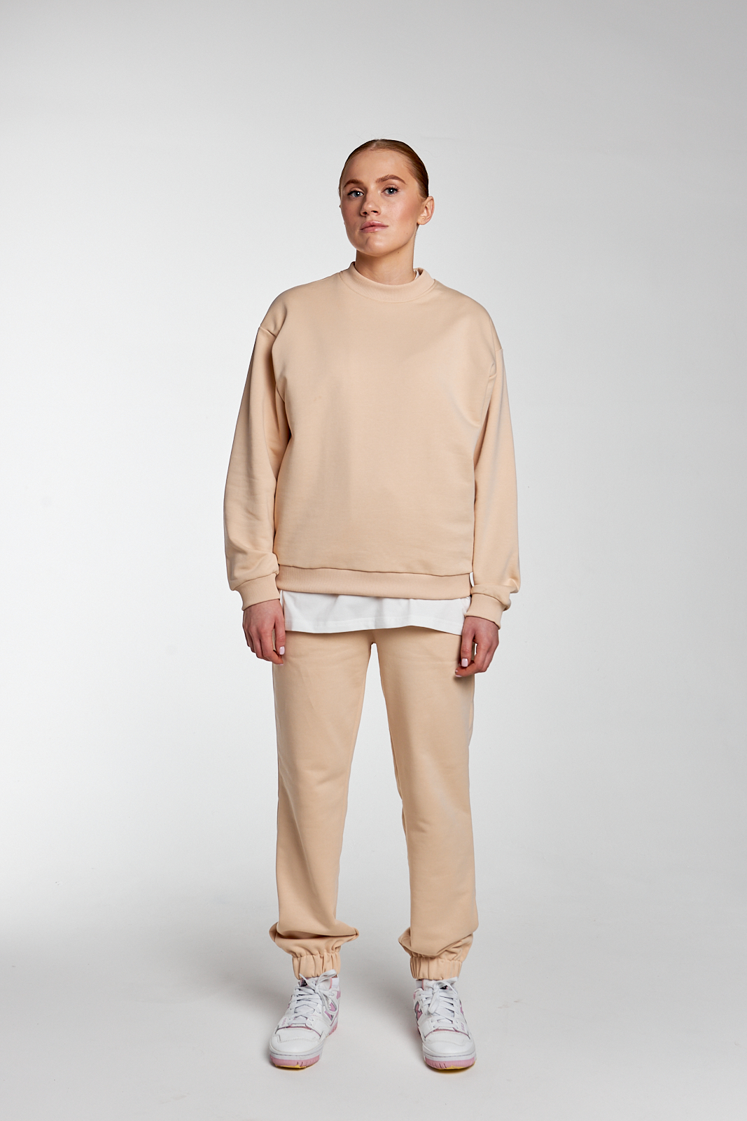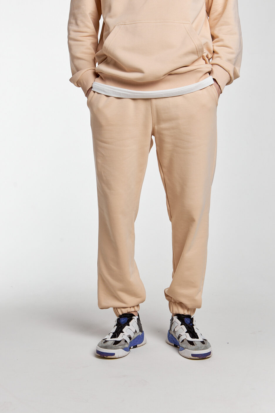 штани у бежевому кольорі мають 2 бічні кишені, затягувальні шнурки, за допомогою яких ви можете змінювати об’єм і посадку на більш бажану, а довжину можна зменшити, підгорнувши манжети знизу, що зробить ваш образ більш мішкуватим ці штани універсальні, їх можна комбінувати з більшістю речей, а для створення костюма можете обрати світшот чи футболку цього ж кольору